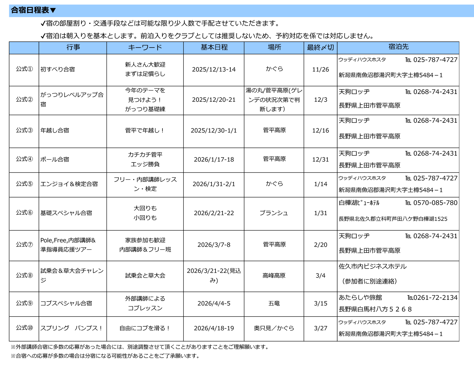 合宿日程表は、リフト券の料金等が記載された完全版が郵送またはメーリングリストで提供されます。